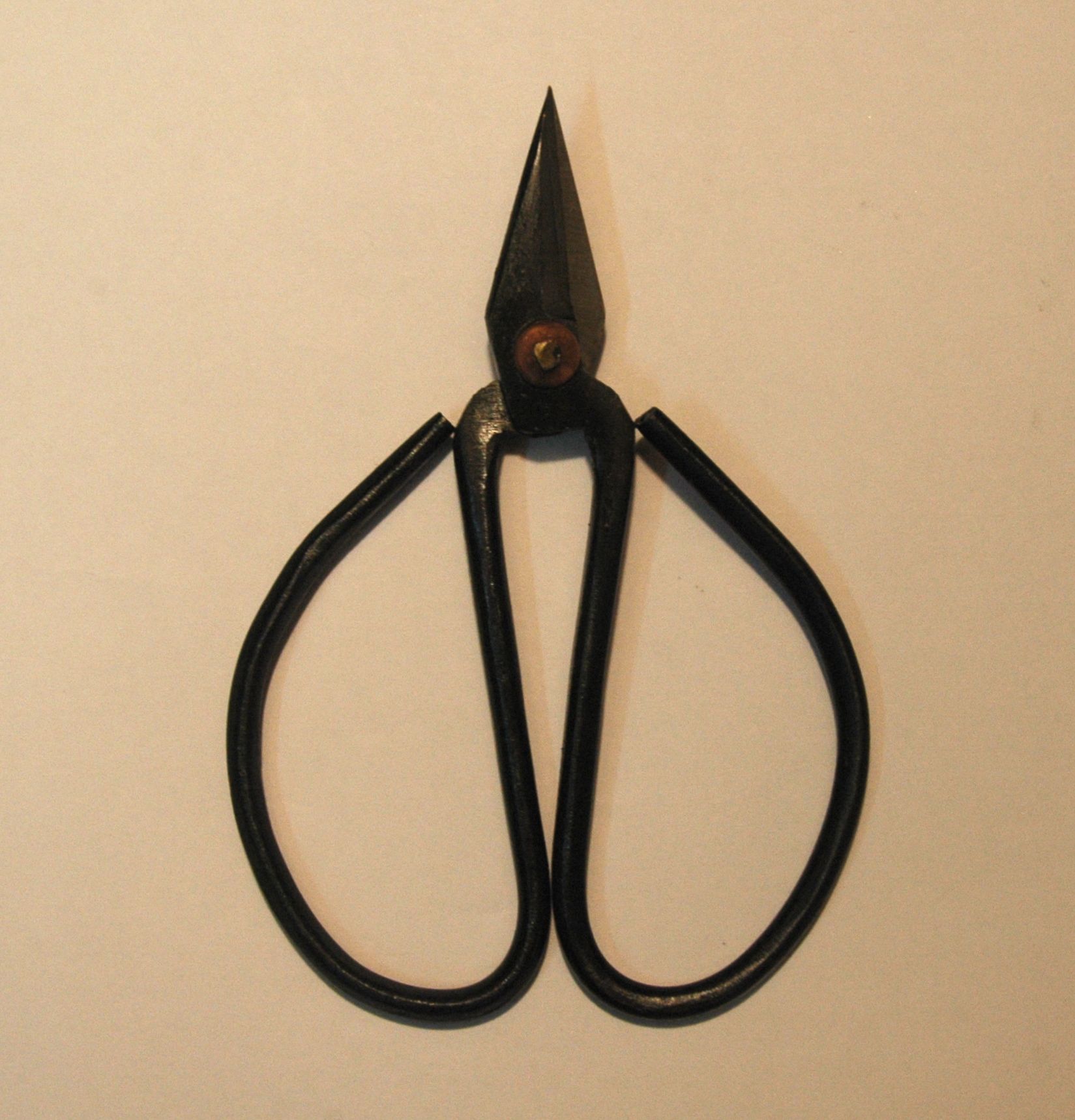 The early form of scissors in China is made with a single piece of flat metal stripe ribboned to form a kind of spring shear. As times goes by the pivot point moved further away from the blades developing better control for the tool. The two parts scissors only started to appear in the Zong Dynasty, the two blades were held by a nail with the rest of the metal bar forming the handle. To reduce the friction caused by the two blades, the blades are made slightly curved, touching only at the pivot and the tips. During cutting only one point will meet to enable the shearing action, this is controlled by the hand movement of the user (so unlike the western scissors, the pivot are tuned loose).