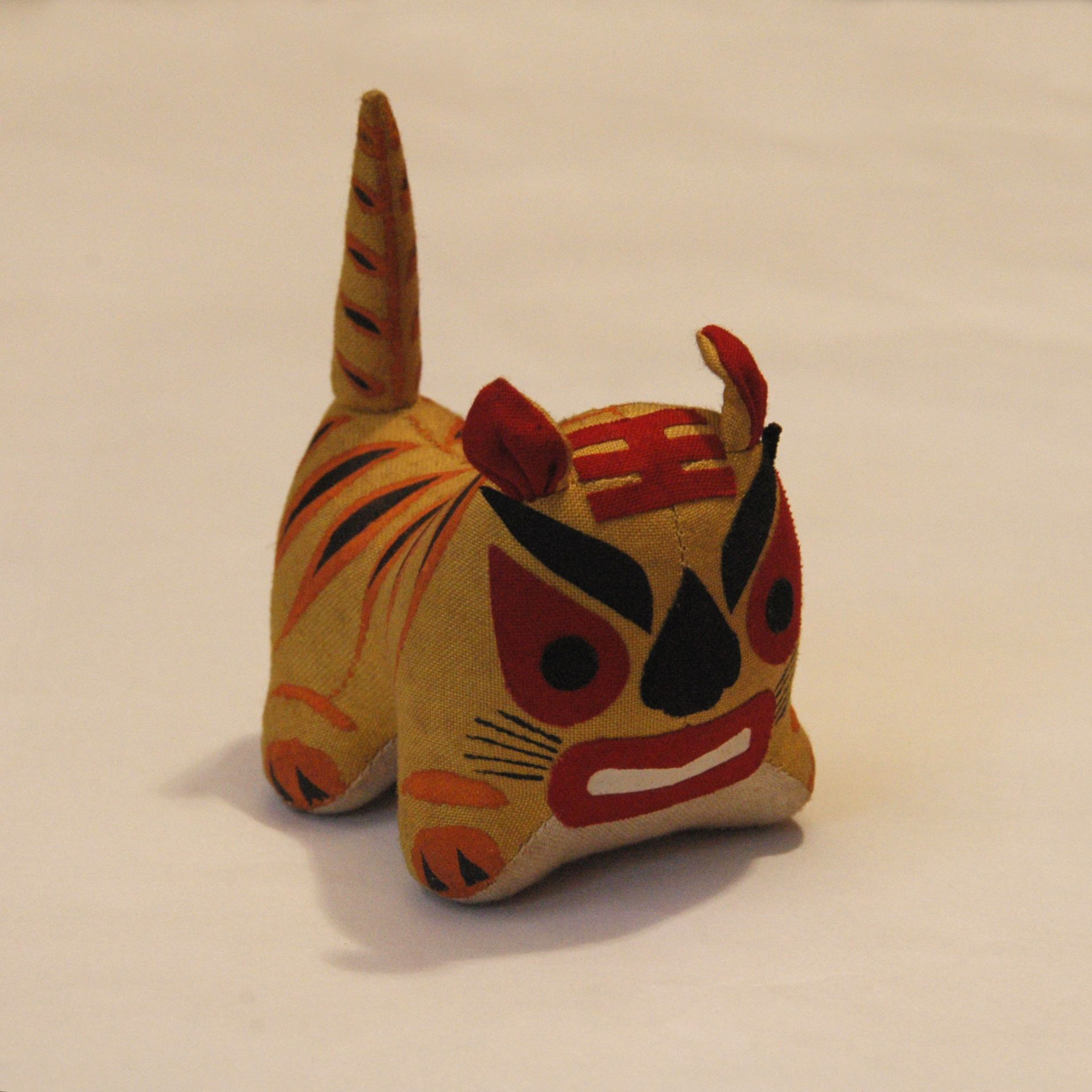 Cloth tiger is a common toy for children in China.  Though we have all kinds of monstrous toys on the market nowadays, it would seems strange for a folk toy to be based on a vicious animal like the tiger.  In the days when life in less protected against nature and disease, the Chinese look on the tiger as a symbol of strength, bravery and good health.  The cloth tiger becomes a symbol of protection and a blessing for the young.  On the 5th of the lunar month of may, the day when ritual would be performed for plague prevention, faces of the children will be painted yellow with tiger pattern for extra protection.  Cloth tiger would be given to a child 3 days after its birth, on its 100 days birthday, 1st and 2nd birthdays and on Chinese New Year as a blessing to the child.