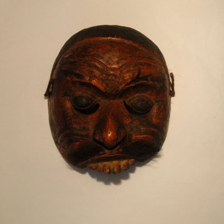 This is a Topeng use for masked dances in Indonesia. This mask would have been worn by the Bondres character , a joker to bring in the humorous elements in the performance. Despite the ugly facial expression, the Bondres are popular character because of the bawdy jokes and satires that poke fun at the current events. The jawless mask was made so for the actor to be able to speak clearly. Each dancer would have his own collection and there are many different of these clown character. The eye brow and moustache are made with goat hair.