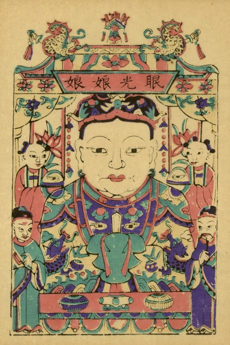 Over Chinese New Year, wood block prints which express good fortune, blessing and protection would be posted in every household, shops, basically anywhere with a roof over (even at livestock are kept). These prints are replaced on every New Year. This print is of the Eye Goddess of the Taoist religion, she is one of the 15 mother goddesses, it is believed that her prayer would heal any problem of the eye. The Goddess print will be displayed in clinic of an eye specialist and at home of those that have sight problem.