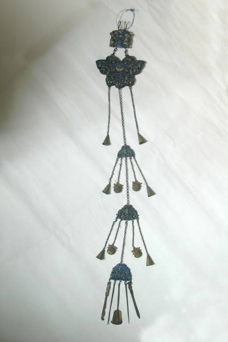 This is a ladies’ silver waist hanging ornament, highlighted with enamel pendant pieces. On the top three layers, small bells are hang making a delightful charm as one move around. At the bottom hung 5 accessories; 2 type of knive, a shove, toothpick and earpick (a traditional Chinese style Swiss army knife).