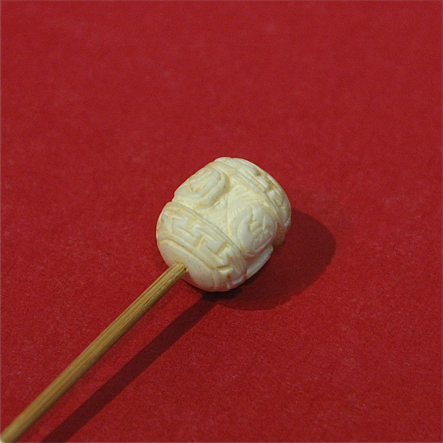This is an buffalo bone bead for the buddhist rosary, Mala. The Mala is used for counting the number of times a mantra has been recited. Bone beads (because of its material departing from the idea of Chinese Buddhism) is not commonly used for the Chinese buddhist rosary. In Tibetan Buddhism, however, the use the nature bones and horns are a reminder of the impermanence of our bodies and that we are, like everything else just a passing phenomenon.