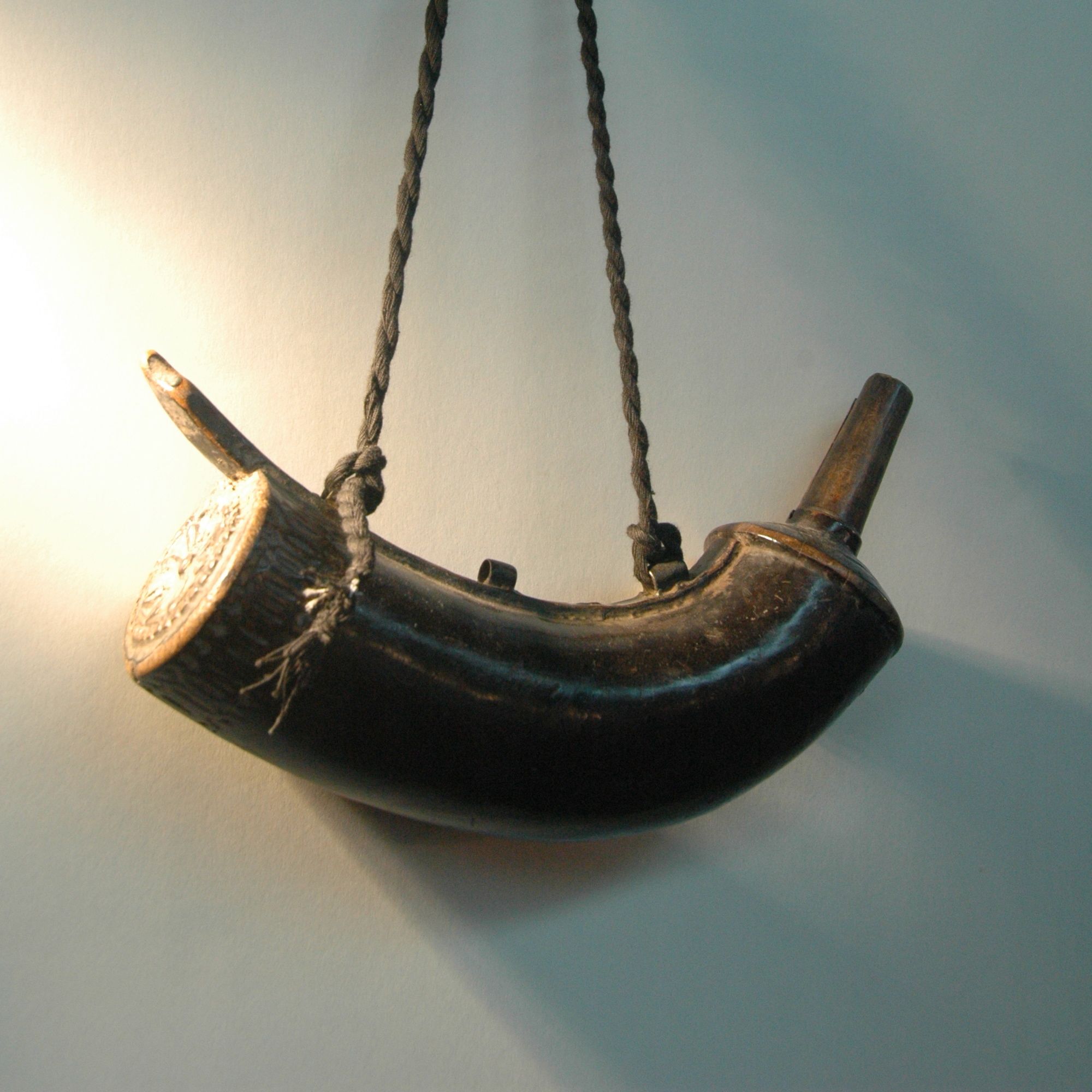 This is a powder horn, a container for carrying gunpowder. It is made with a a buffalo horn with a nonferrous metal for the base and the spout. Powder horns were very common at a time when muzzle loading guns are used, people would store their black powder for ammunition reloads. As the gun making technology advanced with the same ignition process, the need for carrying the powder horn diminished.