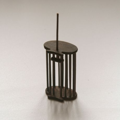 This is another type of bird feeder, a slight cruel one. A live cricket or insect treat is put inside the cage which is then attached to the side of the bamboo bird cage, the gate is opened from the outside and here comes “dinner”! The detail by the gate is for the attachment of the bamboo bar of the bird cage.
