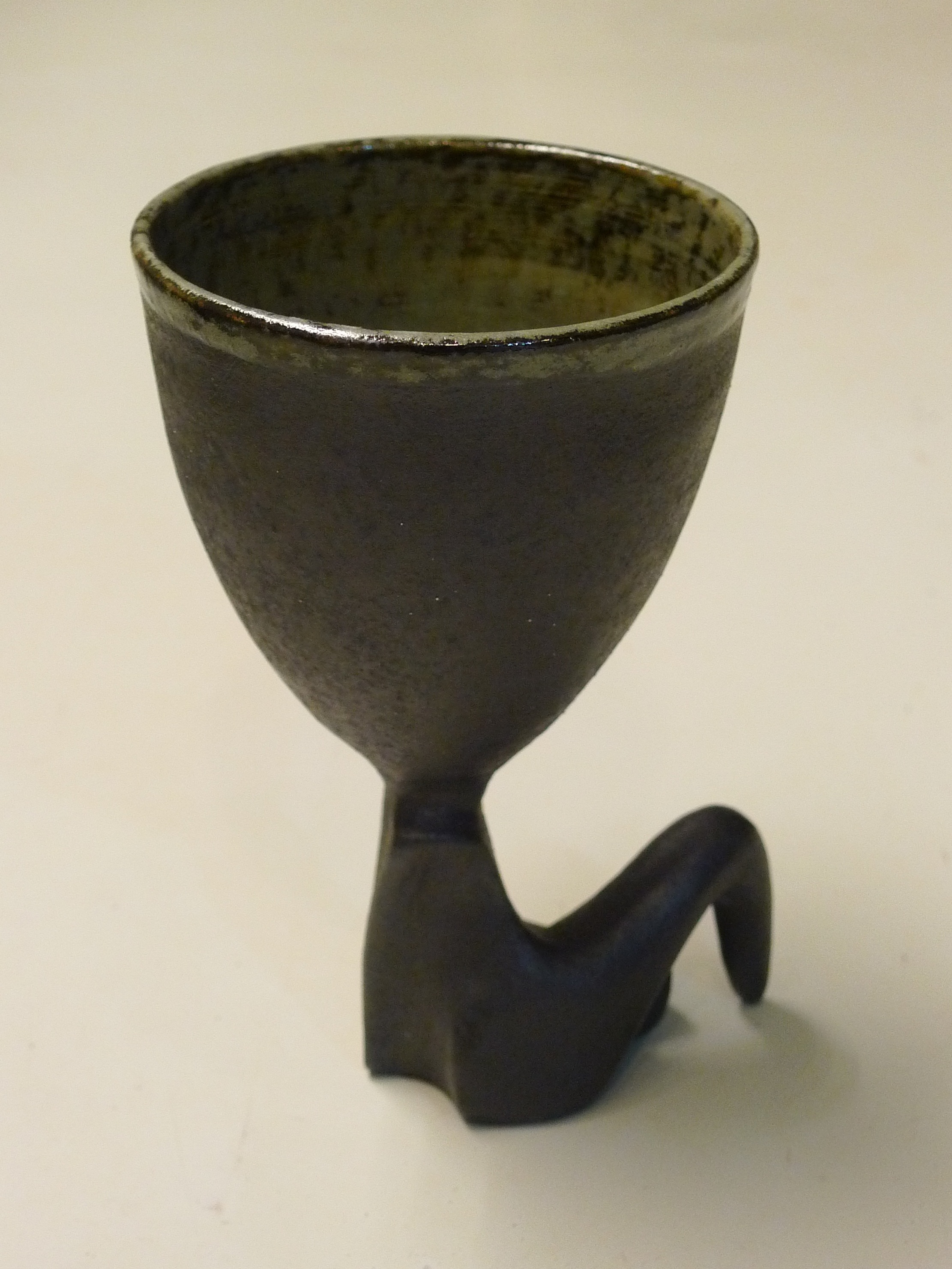 The goblets are created by throwing with a hand build sculptural attachment. Its matte black slip glaze contains high percentage of manganese dioxide, copper oxide , iron oxide and copper oxide, giving an intense blackness, the sculptural part is made by slip casting.