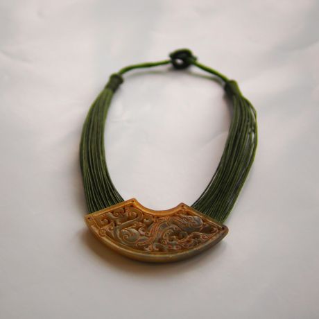 Jade huang is a form used for jade pieces dated all the way back to the Neolithic Age, some 8000 years ago. The arch shaped form started as a part of the costume for the sorcerer when practicing black magic. By Shang dynasty, 1000 B.C., it has developed into a costume ornament which acted as a symbol of social status. The fashion of jade huang ended and took over by the jade pei, a more decorative pendent.