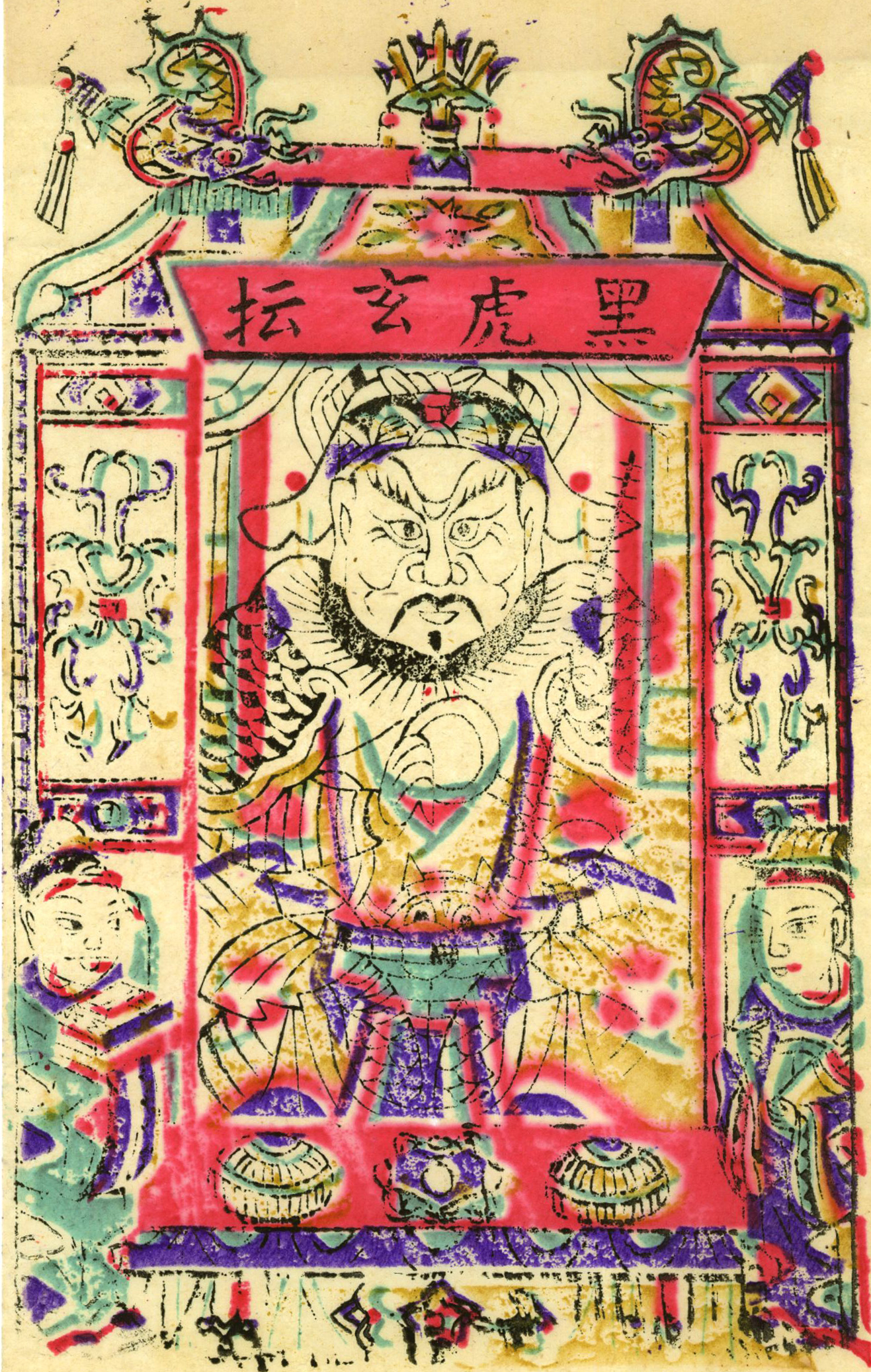 A new year wood block print of the God of Wealth, Zhou Gong Ming. It is believed that Zhou was born in humble family in the Qing dynasty. As a young he worked as a labourer for a wood merchant, being honest, generous and hard working he was popular. Soon he was able to start his own wood business and accumulated a good deal of wealth. Zhou would lend money to those who need them; one merchant borrowed some money and made a lost at a natural disaster, Zhou only asked him to return a pair of chopstick for the money owned. At time of war, Zhou used his own money to fund an army in support of his country and headed the army himself. He bravery was well known and even tamed a troubled tiger as a pet. In most of the God of wealth icon, this black tiger is at his company, here you can see it half hidden inside his coat. Because of his generosity and bravery he was worshipped after his death and named the God of Wealth.