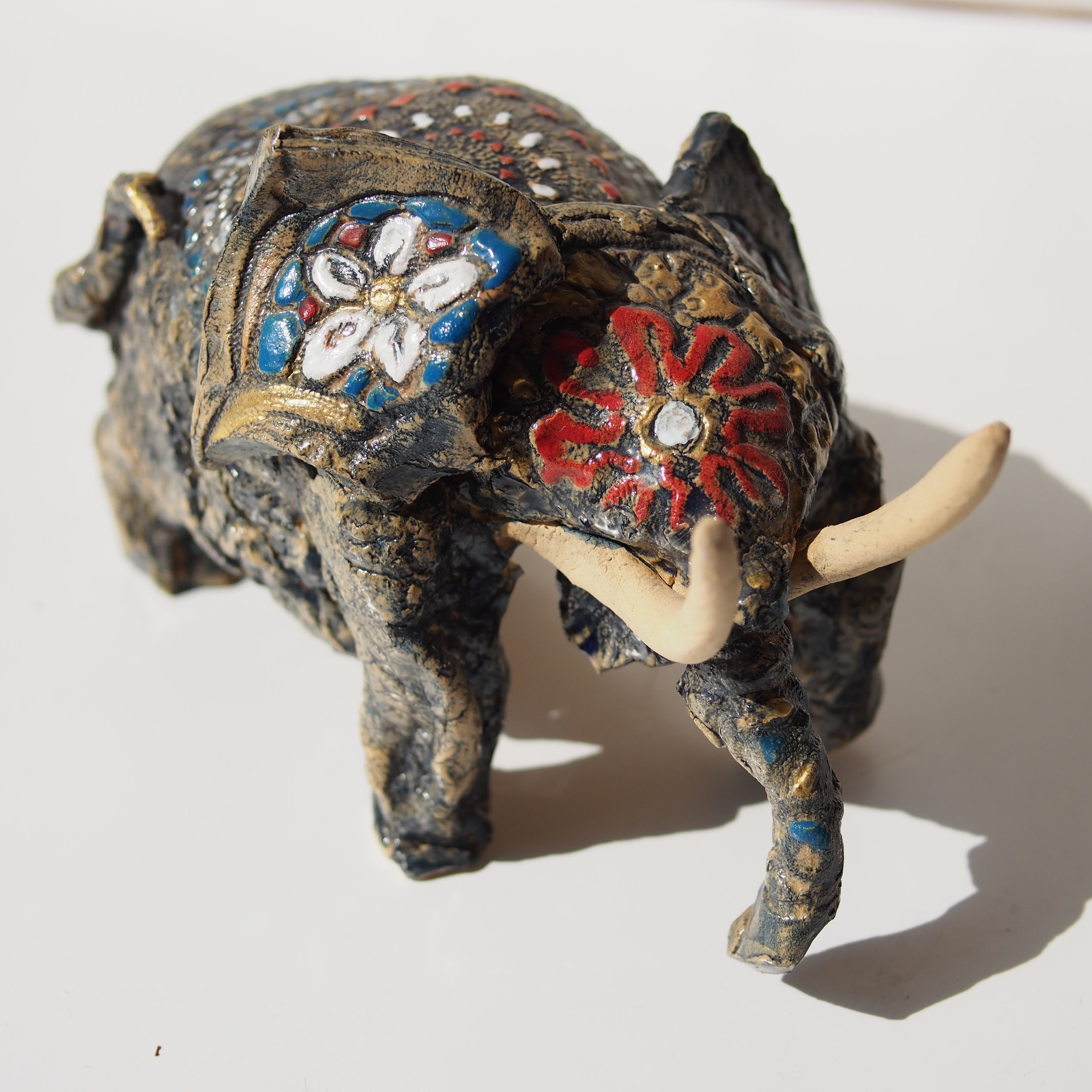 A pottery elephant is made with one single sheet of clay and decorated with under glaze.