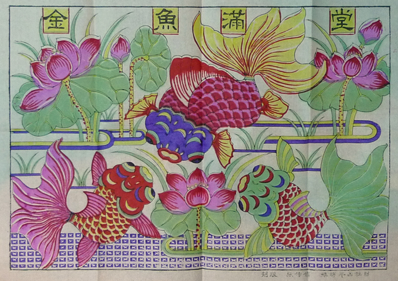 The title for this wood block entitled, A Tank Full of Gold Fish, 金魚滿堂 (jin yu man tang). Though gold fish is a popular pet for the Chinese, the blessing behind the cute gold fish is a play with homophone. The words 金玉滿堂 also share the same pronunciation but instead of gold fish, the large space is filled with gold and jade.