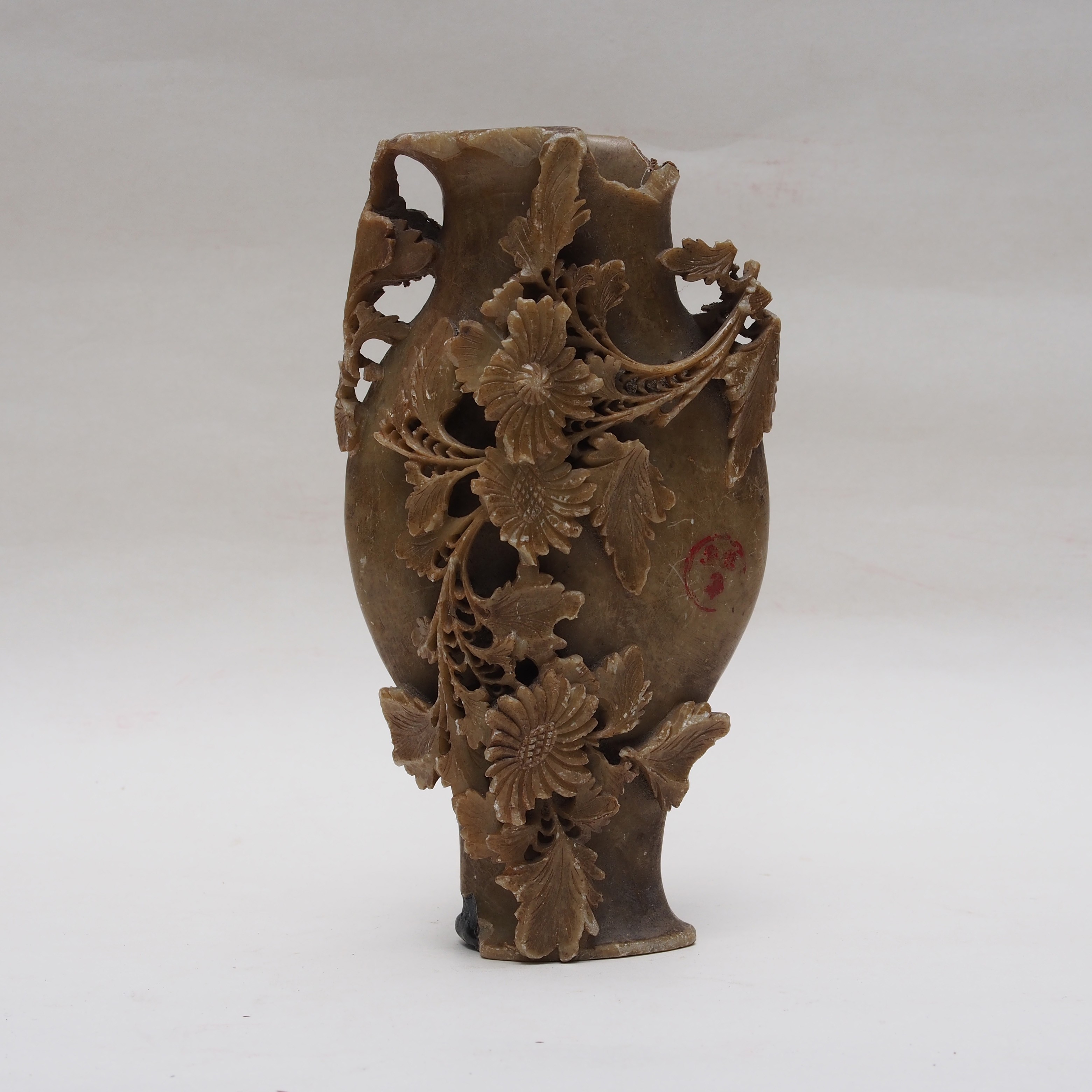 This is a miniature Shou Shan stone  vase which has intricate carving of a chrysanthemum flower.  The Shou Shan stone is wonderful stone for carving, particularly for seals, its also a good material for other ornamental works.  This antique piece of work with its chipping has a sense of  rustic, of the untended nature.