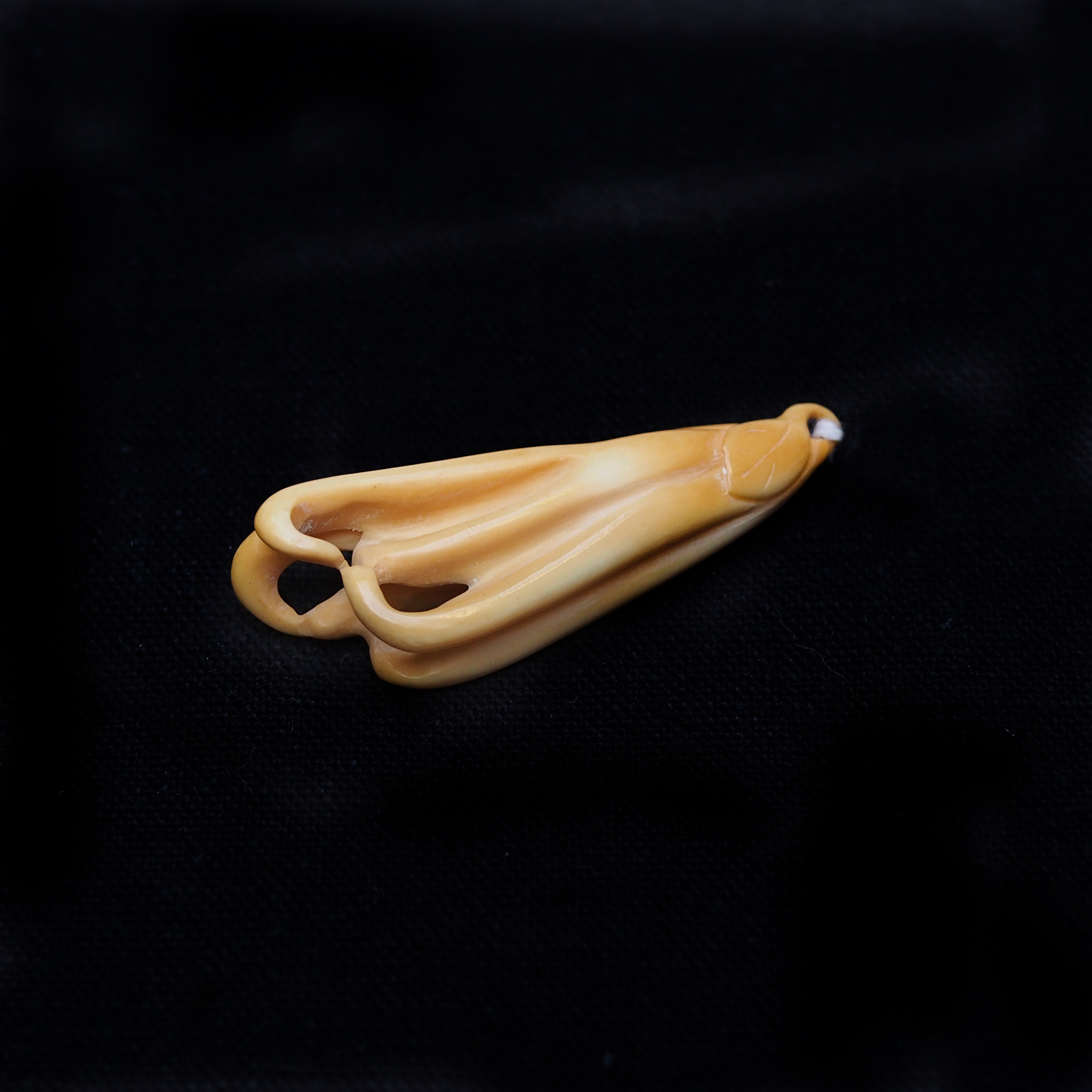 A pendant carving of the Buddha’s hand fruit (Citrus medica var. sarcodactylis).  The shape of this finger like citrus fruit resemble the Buddha’s mundra and often used as an offering in the Buddhist temple, its also a symbol of happiness, longevity and fortune.