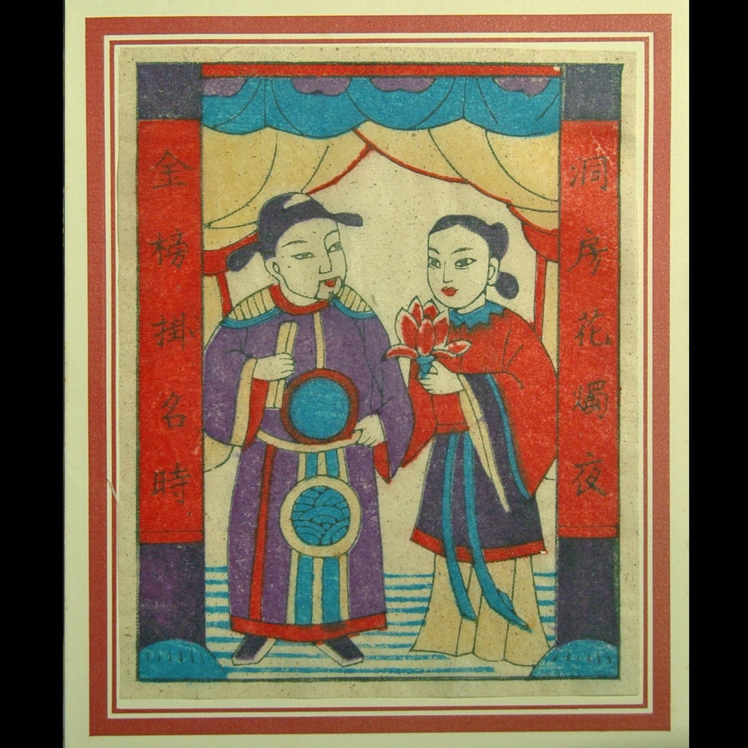 Woodblock prints are traditionally posted to celebrate Chinese New Year, both as a decoration and as a good blessing to the household. The subject matter of the prints surrounds the idea of good fortune, this projects for household to the year ahead. On this particular print, its is written ” On the night of the wedding; when one is selected as an high ranking offical.”. This would probably symbolises the best moment in a man’s life. Adapting to modern day use, this is mounted on a greeting card, perfect for giving well wishes. (US$4)