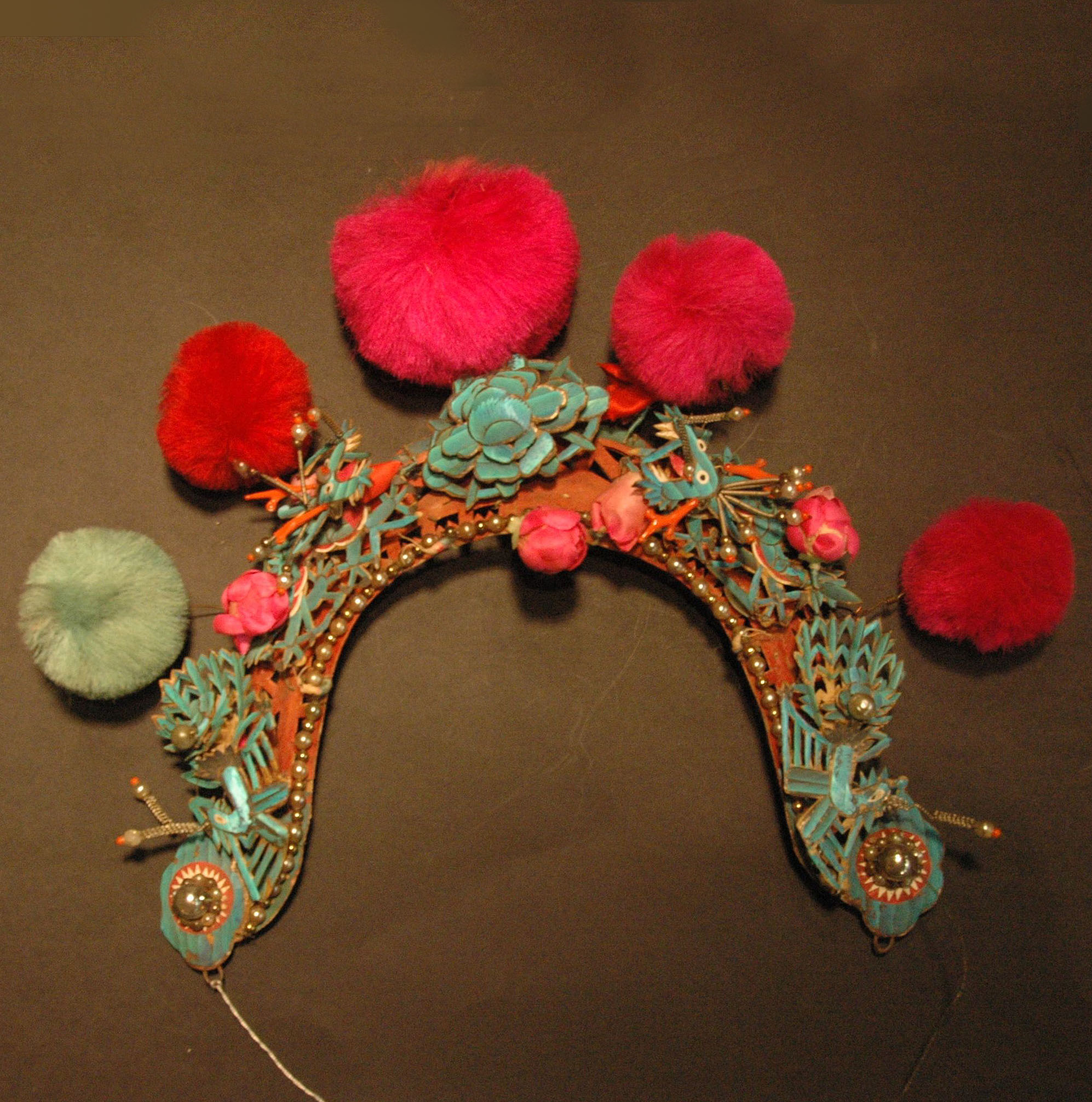 This is the head piece for Chinese opera, a crown used by the female warrior character, resembling the fighter’s helmet. It has one layer of pompons and thus known as word one crown (the chinese word for one is 一, a simple horizontal line)