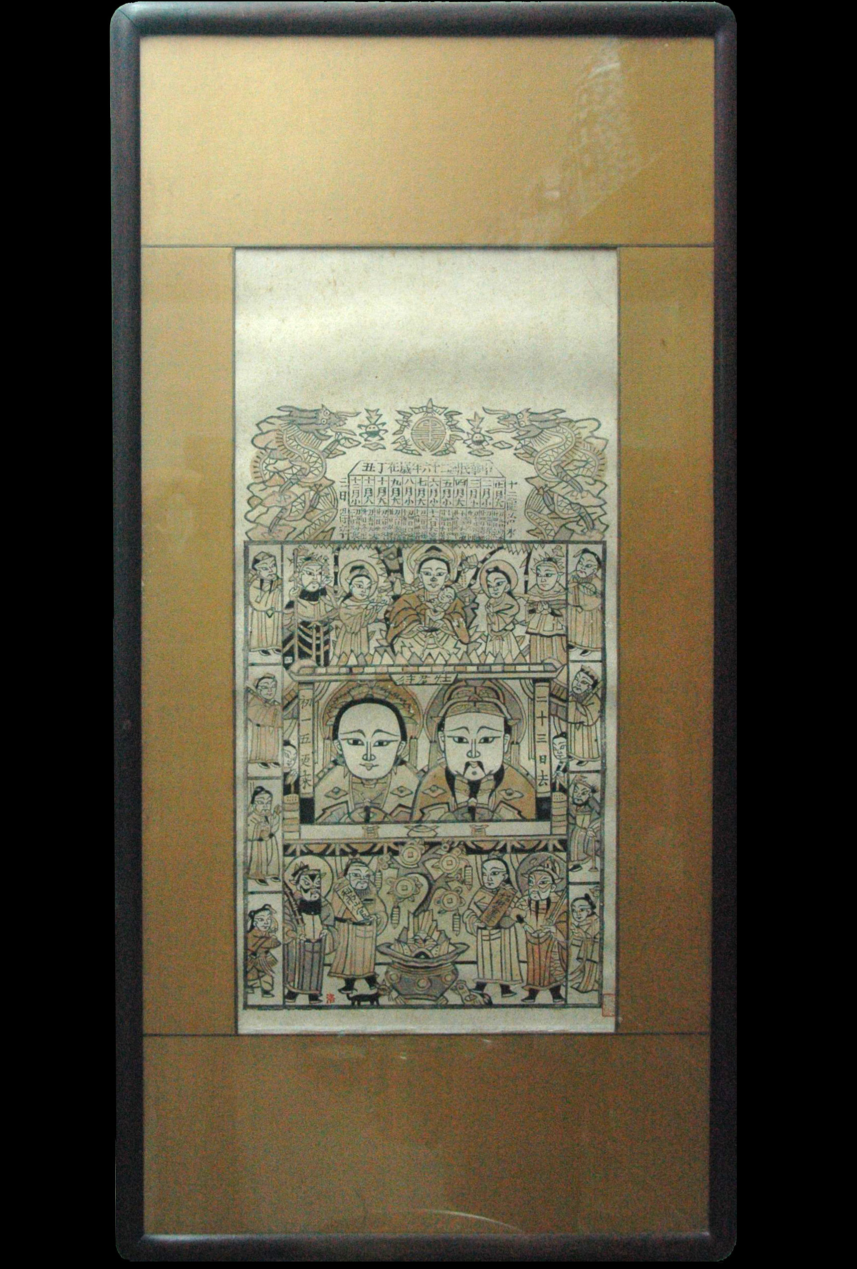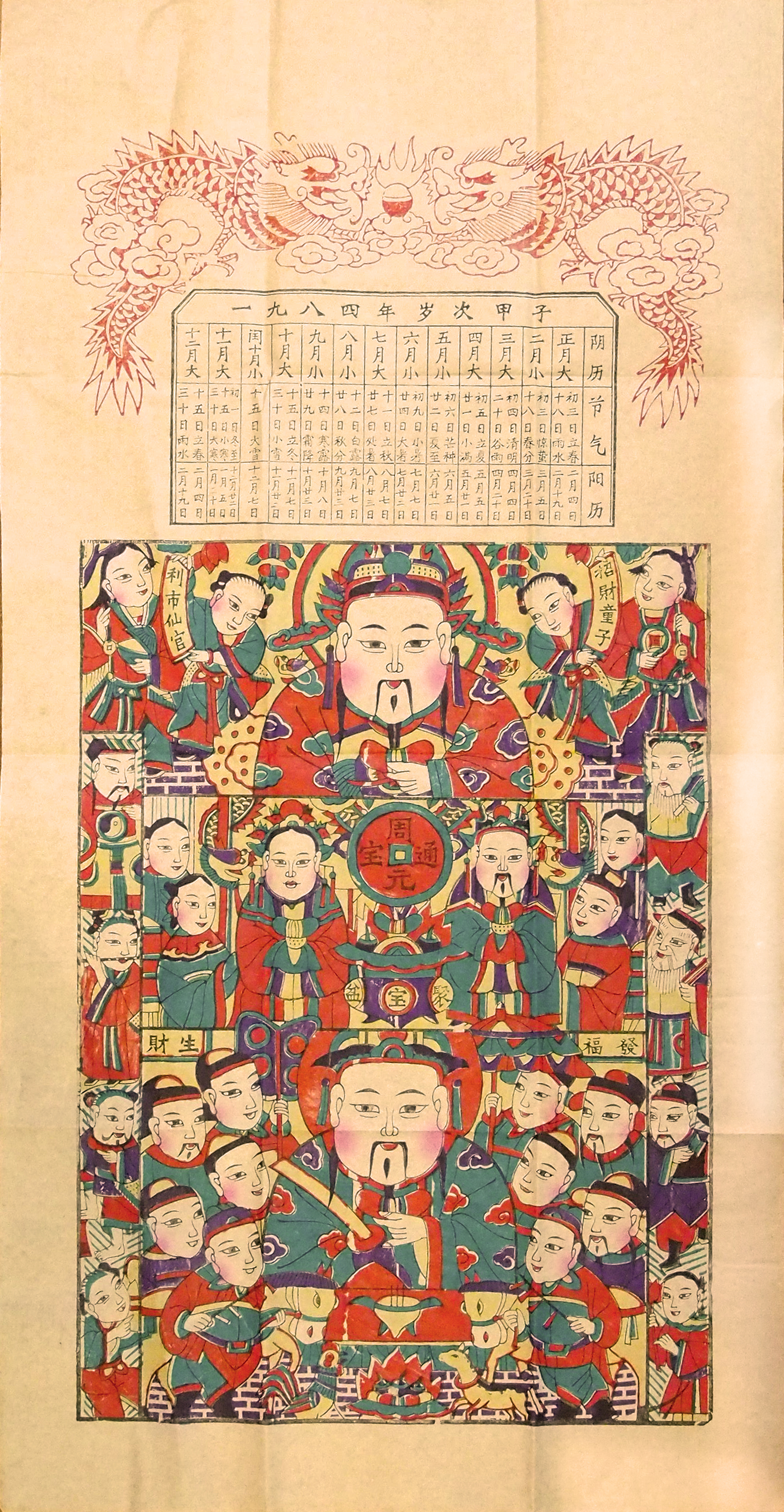 For the annual task of protection and reporting, the wood block print for the Kitchen God are dated with a calendar of that year. This particular print was for the year 1987.