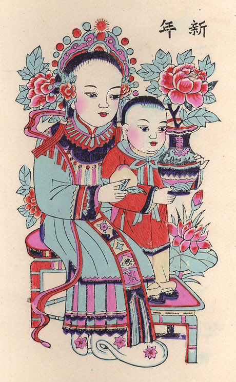 Here is a new year print for the official reopening of the shop after Chinese New Year, 開市大吉. The two cocks is again a homophonic heterograph play on the word lucky, 吉 (Ji), and the word cock, 雞 (Ji).
