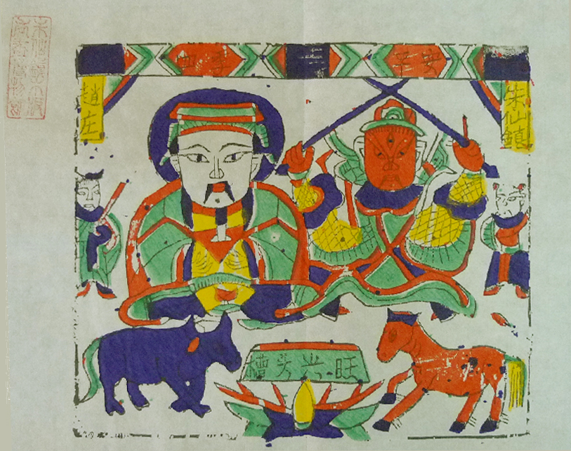 On the left sits the God of the Ox and the right with 3 eyes, the God of the horse, next to them their officers.