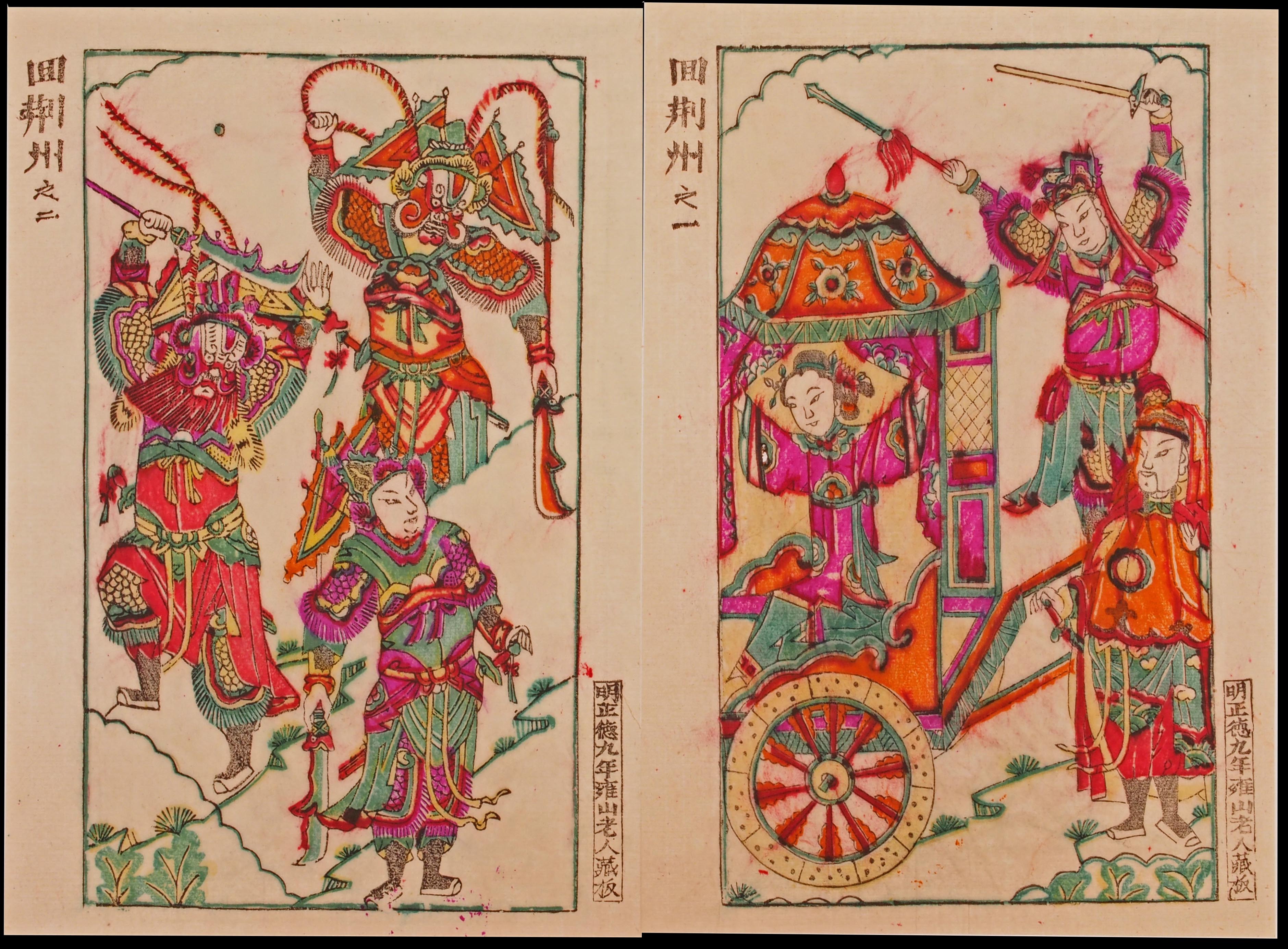 This pair of wood block print is not about blessings but scene from a opera story “Return to Jing Zhou”, set in the 3 Kingdom Period.