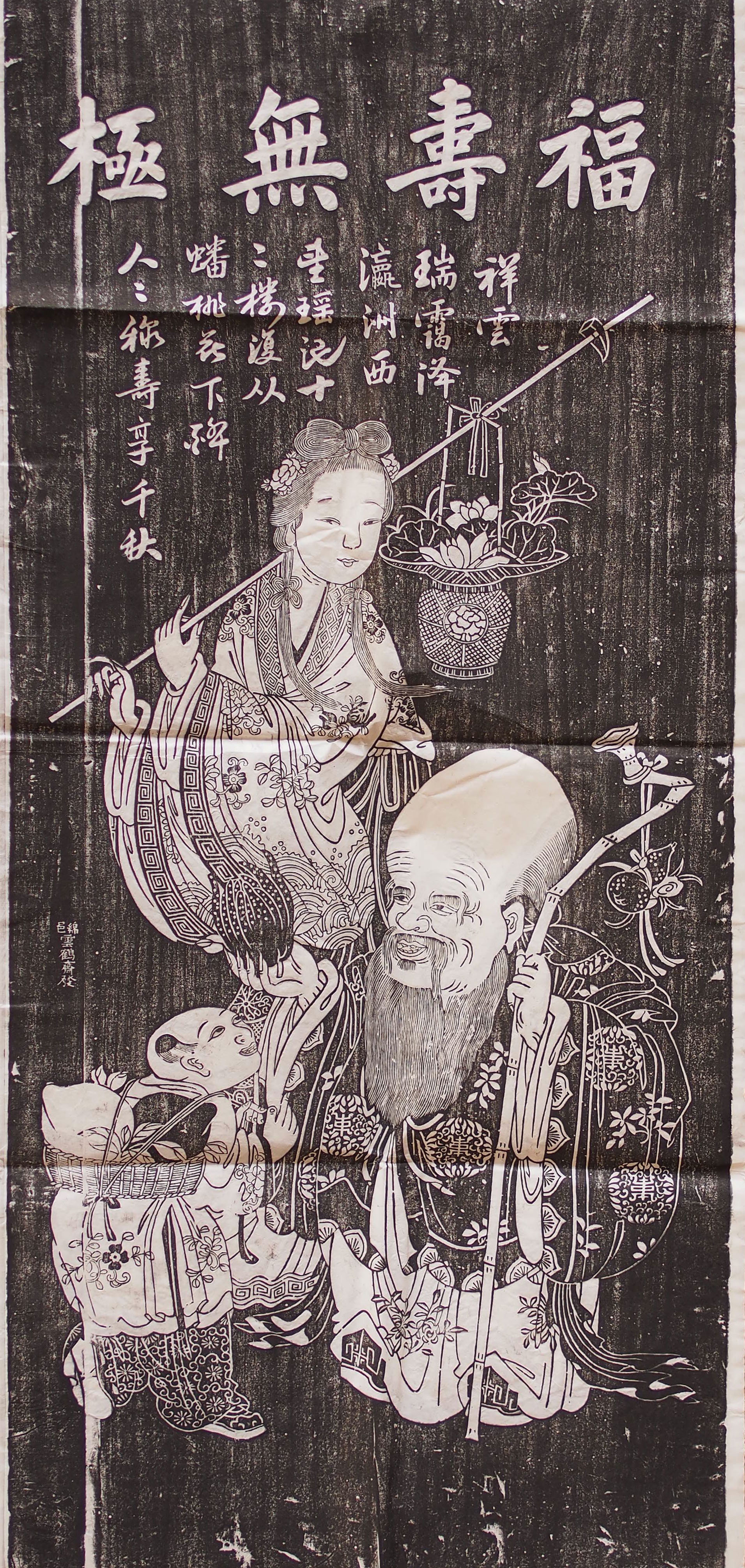 On the top of the print is a hanging bat symbolizing the arrival of blessing. The word upside down (倒) “dao” shares the same pronunciation as the word arrived (到) “dao”, while word bat (蝠) “fu” with the word blessing (福) “fu”.