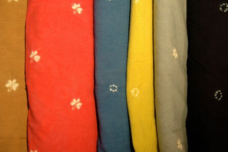 These tie dye are from the Bei minority tribe. It is started with a white piece of cotton cloth, the pattern are marked, area for the pattern are then tied tightly together with threads. When the tying is done, the cloth is first dipped into clear water and then in the dye, it is then hang to let dry and dye again, the dyeing process will take several days to complete. After dyeing, the cloth is soaked in clear water to remove any excess dye, the threads are removed and the cloth washed and the cloth stretch out. The white pattern are the are kept out from the dye from the tightly tied knots. The dark blue is the colour traditionally used for Bei tribe tie dye, we have requested for the additional colour to be made (all colours are traditional vegetable dye used by the Bei minority)