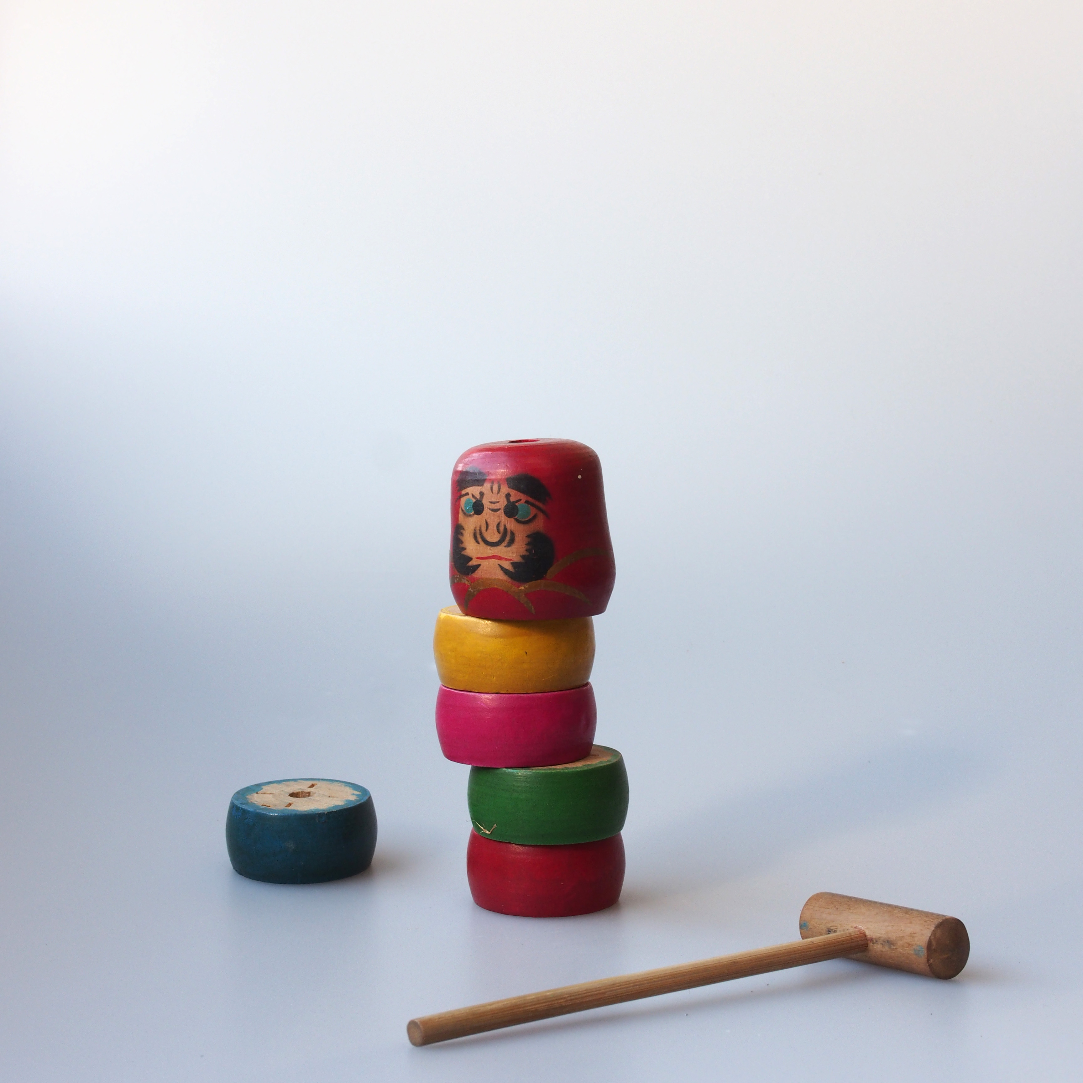 The aim of the game is to knock off the 5 colour pieces below the Daruma while keep him upright and not falling over. An upright Daruma at the end of the game would symbolize a success for his meditation and also good luck for the player.