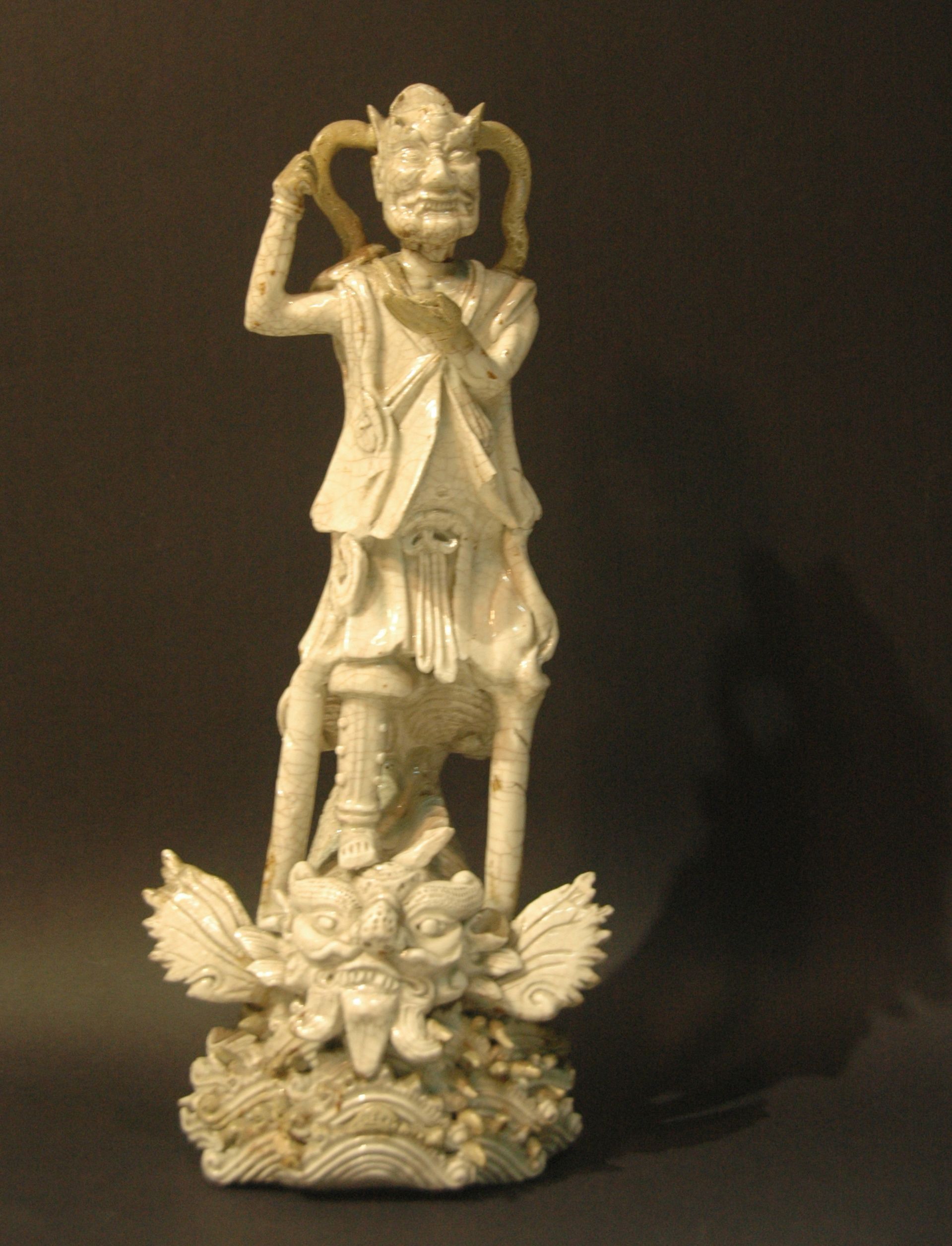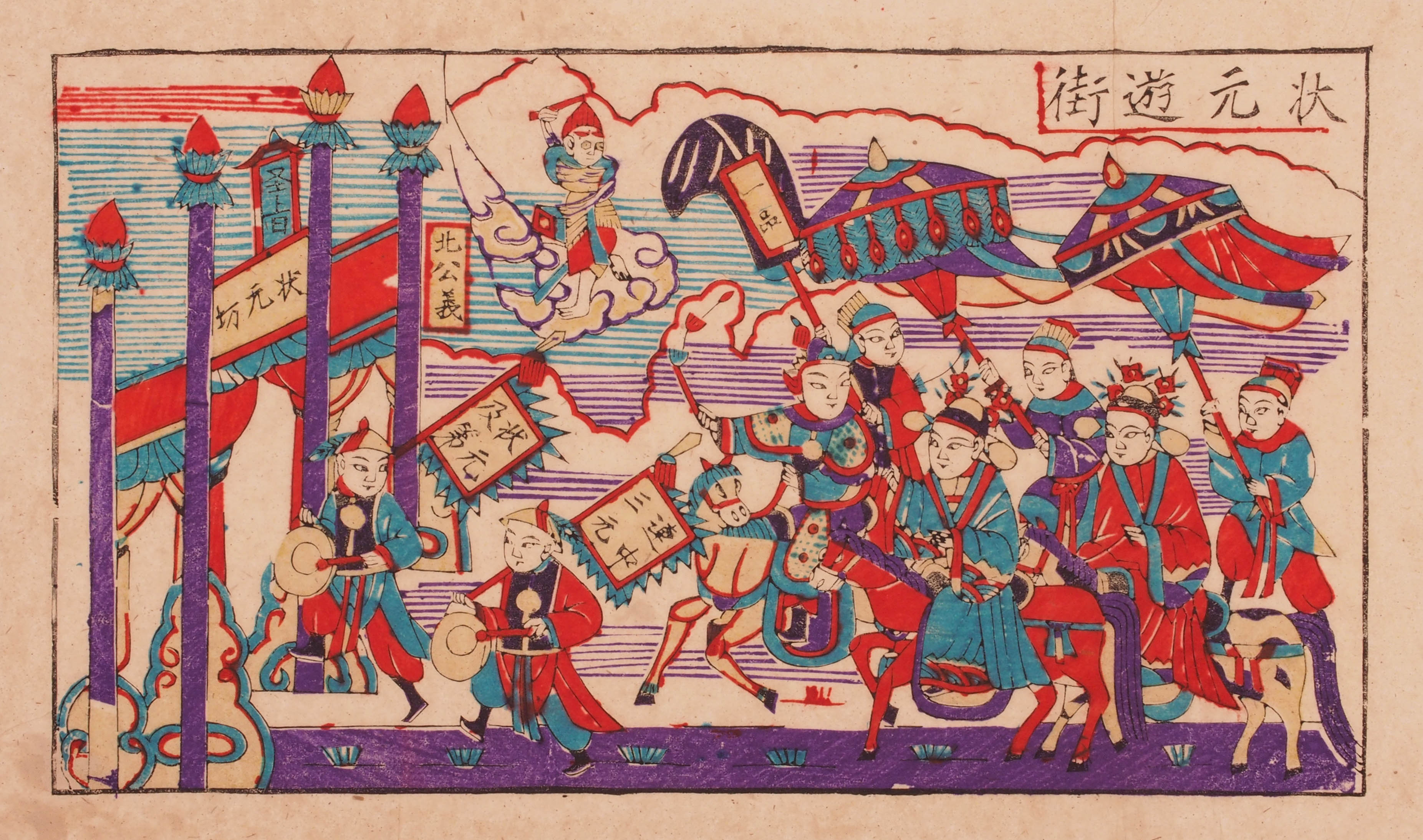 In old China, society is generally organised by different class, it would be extremely difficult to excel beyond where one is set to belong. In the Siu dynasty, a system for selecting a top official post was introduced. By way of a series of literature examinations, unlimited by one’s background the best is chosen purely from his knowledge. The scholar who comes first in the examination is known as the Zhuang Yuan and would be appointed directly by the emperor. It therefore became every parents’ dream for their son to become the Zhuang Yuan. After his appointment the Zhuang Yuan would parade from the capital all the way home. The villagers are proud to welcome the scholar home, in fact so proud that the alley where he used lived would be renamed. In this print, the gate on the left is known as “Zhuang Yuan Place”. In front of the gate, leading the parade are two soldiers bang on the gongs and carrying the banner 状元及第 “Zhuang Yuan Ji Di” (the new title of the scholar) and 連中三元 (coming first in all three exams). Behind them, the two men with flower decorated hats are the Zhuang Yuan and the one in armor the military Zhuang Yuan (who came first in martial art). What more can one wish for if a family can have 3 sons all to become Zhuang Yuan! On the sky, there is a ghostly figurine, he is Kui Xing, the saint in charge of who becomes Zhuang Yuan.